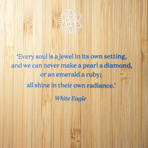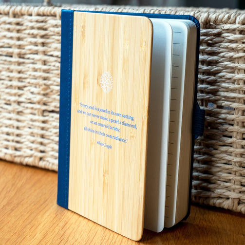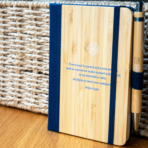 This beautifully bound notebook, with FSC certified paper, features ruled pages and a blue ribbon marker, paired with a White Eagle Lodge pen. The cover carries words from White Eagle celebrating the distinctive light each person brings to the world: